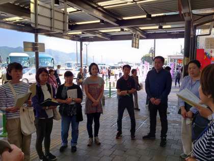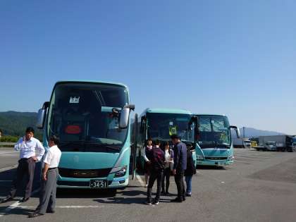 談合坂で打ち合わせを終えて、10時5分出発。これからバスは、レクがはじまります。レク係よろしくお願いします。