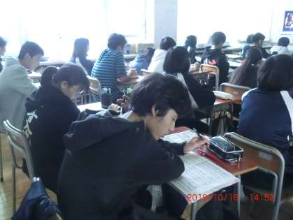 合唱コンクール放課後練習2 10月18日(金) 公開日 2019/10/18 更新日 2019/10/18 できごと 2年生は、昨日のリハーサルの映像を一人一人が真剣に見ていました。楽譜にメモを取っている人もいました。 いいね(0)