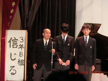 合唱コンクール3年B組 公開日 2019/10/26 更新日 2019/10/26 できごと 令和元年度の合唱コンクール最後を飾るクラスB組です。自由曲は「信じる」。仲間を信じて歌い上げました。 いいね(0)