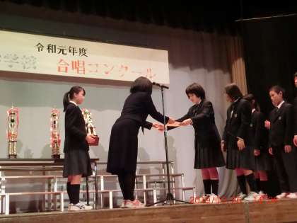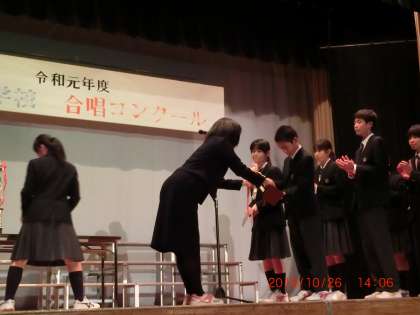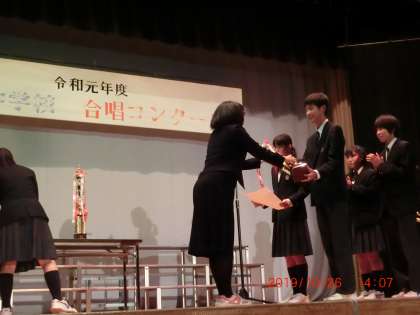 実行委員が代表で、賞状とトロフィーを受け取りました。I組、1年D組、2年C組です。