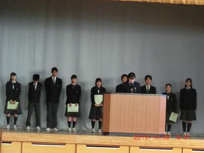 生徒会朝礼 10月30日(水) 公開日 2019/10/30 更新日 2019/10/30 できごと 後期生徒会活動がはじまり、生徒会朝礼では、役員からの報告、各学年学級委員長、各専門委員会委員長からの反省と11月の活動について報告がありました。キャンペーンなどいろいろな企画があります。弦中生の自主自立自治に向けてしっかりと取り組みましょう。 いいね(0)