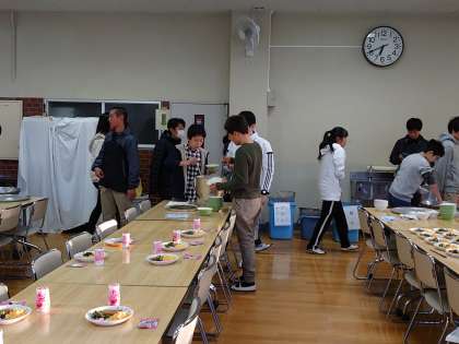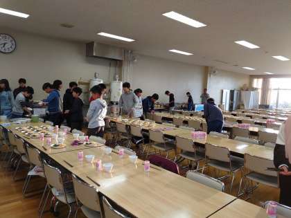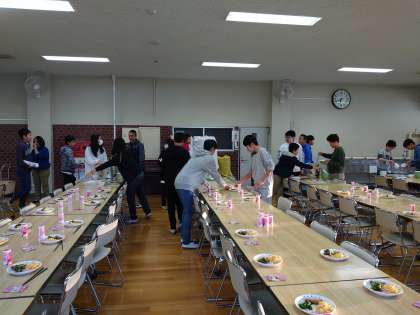 朝食準備。食事係が協力して働きます。先生たちのテーブルも自主的にやってくれました。ありがとう。