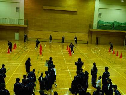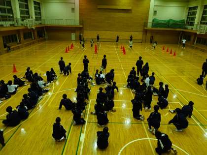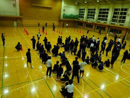 最後のゲームは、クラス対抗で、障害物リレーです。ピンポン玉と新聞紙がバトンです。どのクラスが勝つか楽しみです。