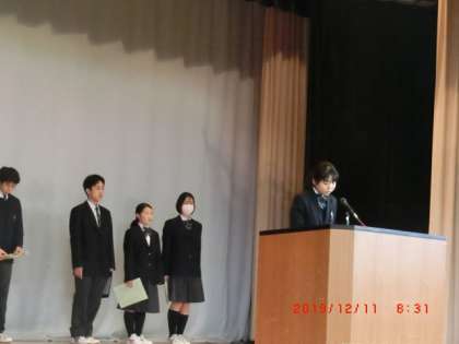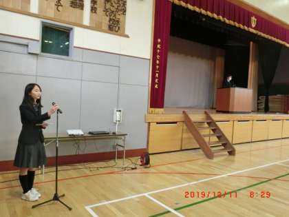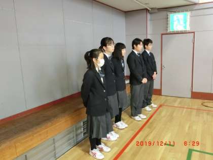 12月生徒会朝礼1 12月11日(水) 公開日 2019/12/11 更新日 2019/12/11 できごと 生徒会朝礼がありました。生徒会長より台風19号の義援金募金の報告がありました。次に、学級委員会より11月の活動報告と次の目標や活動について報告がありました。 いいね(0)