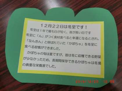 冬至に向けた給食 12月20日(金) 公開日 2019/12/24 更新日 2019/12/24 できごと 22日(日)冬至に向けて、20日の日の給食メニューは「かぼちゃ」でした。冬至は1年で一番日が短く、夜が長い日です。インフルエンザ等も予防にもなると思います。栄養をたくさんとって、早寝早起きです。 いいね(0)