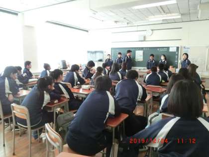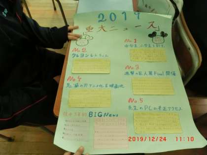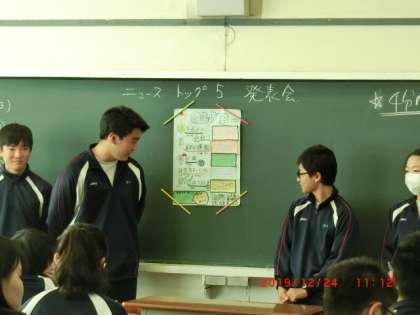3年生は、班ごとに2019年重大ニュース5について話し合ってまとめたことを発表していました。
