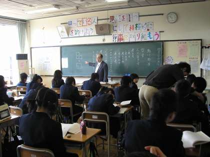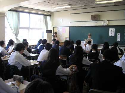 昨年度試行させていただきました教科日本語の授業に地域の方を支援員としてお招きし、本校教員とのティームティーチングを行うことを今年度本格的に実施することとなりました。支援員として、昨年度同様鮎川ご夫妻と本校学校運営委員長の苗代様にお願いしております。鮎川ご夫妻はお二人とも小学校の校長職をご退職され、ご主人は現在弦巻小学校の学校運営員をされております。ご主人に1年生の哲学を、奥様には2年生の表現を苗代様には3年生の日本文化に携わっていただきます。写真は、26日(火)に行った1年生哲学の授業と本日行った2年生表現の授業です。