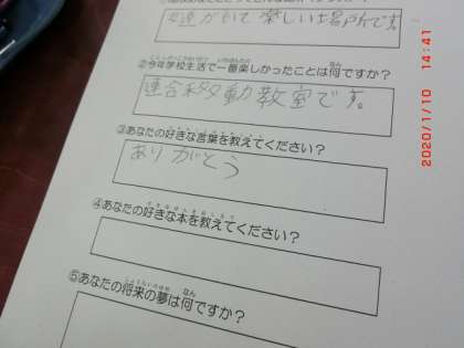 学校公開2日目5 1月10日(金) 公開日 2020/01/10 更新日 2020/01/10 できごと I組では、21日の小中交流会にむけて、準備をすすめています。また、生徒会機関紙「箙」のアンケートも行いました。「I組はどんな場所でしょう」という設問に、楽しい場所、友達と一緒に楽しく過ごせる場所、すてきな場所…など、I組のみんなにとって楽しい場所になってくれていることが分かりました。もっともっと、みんなで素敵なクラスにしていきましょう。 いいね(0)