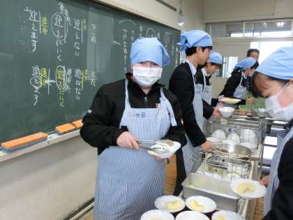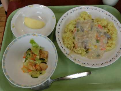 ウィニペグ市姉妹都市交流8 1月23日(木) 公開日 2020/01/23 更新日 2020/01/23 できごと はじめてのランチタイム、給食です。C君は、給食当番を経験しました。一つひとつ丁寧にリンゴの配膳をしてくれました。 今日のメニューは、ドリアとサラダとリンゴです。 いいね(0)