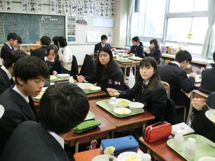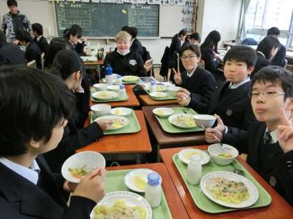 準備完了。みんなでそろって「いただきます」をしました。日本の給食はどうですか。と聞いたら、Sさんは「とてもおいしかった」と言ってくれました。
