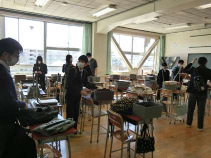 分散登校日9 3月24日(火) 公開日 2020/03/24 更新日 2020/03/24 できごと 午後に入り、2年C組、1年C組が登校してきました。2年生は、自分たちの机を3年生のクラスに移動します。 いいね(0)