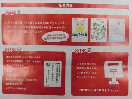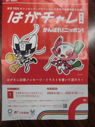 延期になってしまいましたが、オリンピック・パラリンピック日本選手団を応援するチャレンジです。はがきに応援メッセージを・イラストを書いて送ると、2020名にオリジナル切手があたるイベントです。