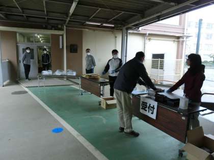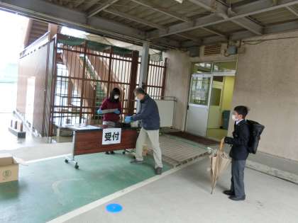 あいにくの雨の中、1年生の教科書の配布が出身小学校ごとにはじまりました。