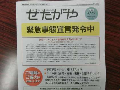 世田谷区広報誌「せたがや」(4月25日版) 公開日 2020/04/23 更新日 2020/04/23 できごと 本日学校に届いた「せたがや」には、大きく『緊急事態宣言発令中』が一面トップに飾られました。ぜひ、読んでみてください。世田谷区民の皆さんへの協力のメッセージです。 いいね(0)