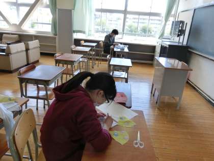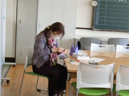 家にある着なくなったTシャツやハンカチなどで、「マスクづくり」をしてみませんか。家庭科の授業で使っている裁縫セットを持っていますね。それを出してきてください。針と糸、布でマスクを作ってみましょう。今、学校でも製作中。自分だけのオリジナルマスク。家族の人にプレゼントしても喜ばれます。「さあ、チャレンジです」