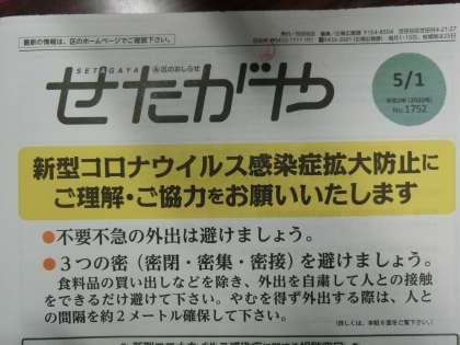 広報誌「せたがや」に保坂区長から『緊急事態宣言を受けて世田谷区民の皆さんへ』とメッセージがありました。世田谷区で確認されている陽性者の方は、4月20日現在280人います。3月26日には21人だったので、25日間で13倍だそうです。