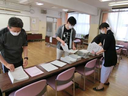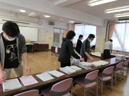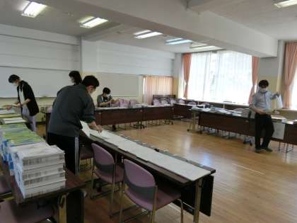 弦中学習プログラムスタートに向けて3 5月8日(金) 公開日 2020/05/08 更新日 2020/05/08 できごと 三密を避けるために、各学年時間差をつけて作業をすすめました。教科書配布以来なので学習課題以外に、配布するものが多く大変でしたが、勤務している教員で協力して行いました。3年生の様子です。 いいね(0)
