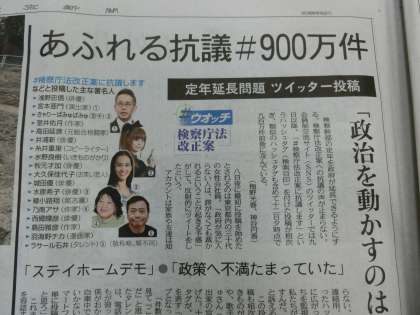 現在国会で話し合われている法案「検察法改正案」への抗議の声が止まらないというニュースです。これは、検察幹部の定年を政府が延長できるようにするという法案です。SNSのツイッターで9日以降、「#検察庁法改正案に抗議します」という投稿等、反対や講義の投稿がが900万件前後に及んでいる。