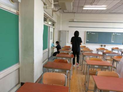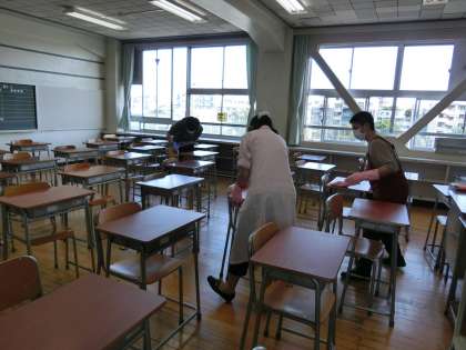 皆さんが下校した後、先生たちは、教室、廊下、階段、トイレなど分担して消毒をしています。ご苦労様でした。