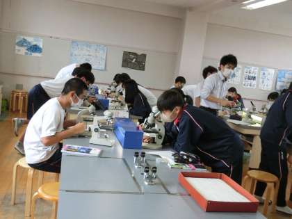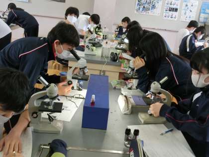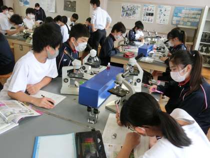 理科の授業は、顕微鏡で細胞の観察。みんな見えましたか?