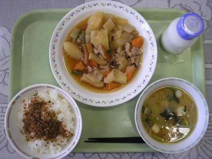 私の好きな給食メニューシリーズ第4弾 公開日 2011/05/31 更新日 2011/05/31 校長室より 今日の私の好きな給食メニューは、肉じゃが風うま煮でした。ふりかけごはんとの相性も良く、純和風のメニューでしたね。(校長) 写真左から:ふりかけごはん・肉じゃが風うま煮・具だくさん味噌汁・牛乳 いいね(0)