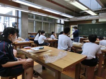 学校生活1 7月9日(木) 公開日 2020/07/09 更新日 2020/07/09 できごと I組作業の授業。先週から製作中のクラフトバンドの金魚づくりも終わり、いよいよ木工作品です。先生が作った大きな金魚も見せてもらいました。家庭科は、引き続きスエーデン刺繍に取り組んでいました。 いいね(0)