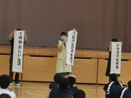 養護の鈴木先生よりコロナ対策についてお話しをしてくれました。
