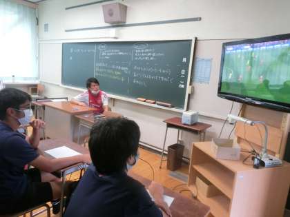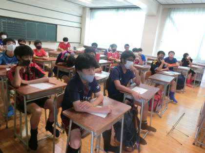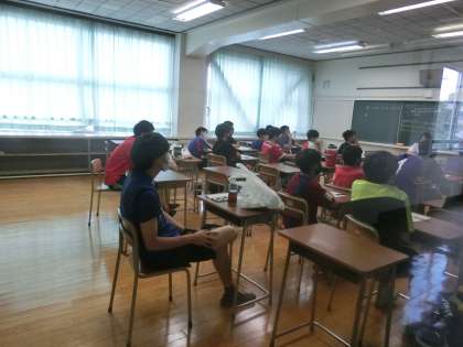 サッカー部もまだ暑いので、教室でブラジル戦のビデオを真剣に見ていました。ちょうど、私が行ったときはメッシが得点を入れていたところです。明日からしばらくお休みになるので、今日も頑張りましょう。熱中症にならないように!!