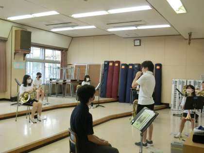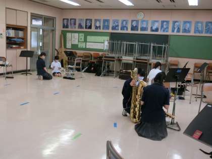 吹奏楽部も音楽室、パソコン室に分かれ、ソーシャルでスタンスをとって練習に励んでいました。