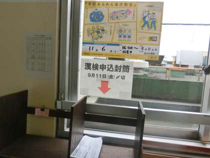 11月6日に実施予定の漢字検定の申し込みの締め切りが9月11日です。職員室前の棚に申し込みの封筒が置いてありますので、受検を考えている人は、もっていきましょう。