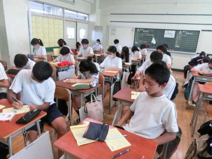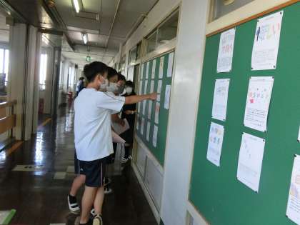 時間を決めて、順番にポスター見学をしました。3年生は、生け花教室の講師の先生にお礼状も書いていました。