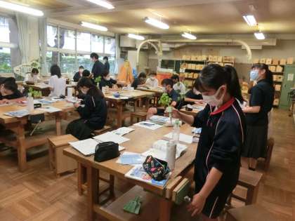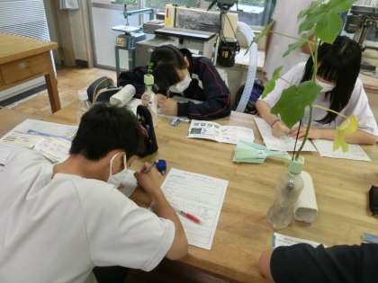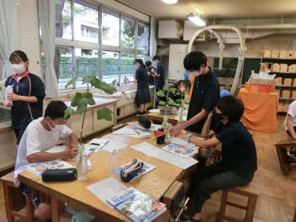 2年生技術の授業は、ペットボトルで野菜栽培。各自育てている野菜の観察等を行っていました。