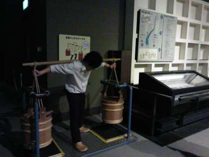 展示してある肥桶をかついで、思わずその重さにビックリ。