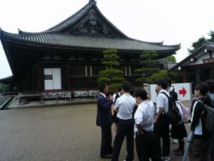 三十三間堂でガイドさんの説明を聞いています。