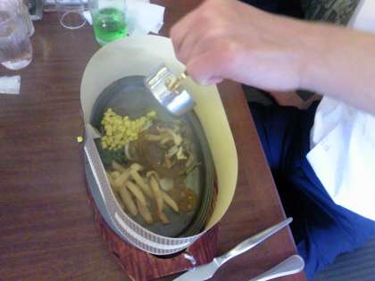 お昼の時間です。ファミリーレストランでハンバーグを食べます。