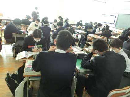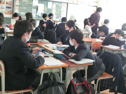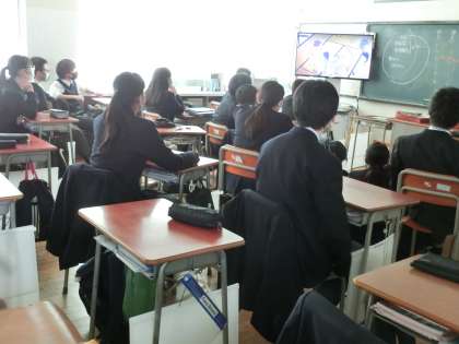 理科の授業では、班で話し合い中。2年生の道徳は、戦争と平和を考える授業で「この政界の片隅に」の最後の場面を鑑賞中でした。