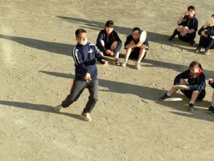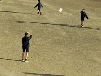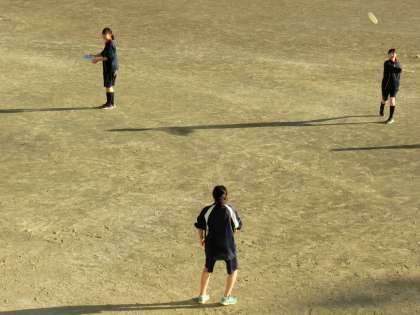 2年生体育、アルティメット。新しい投げ方を教わり、練習中。