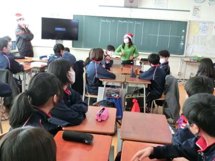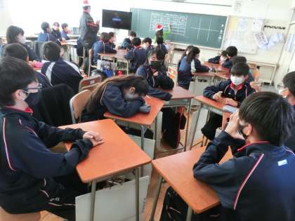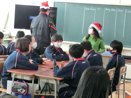2学期最後の授業1 12月24日(木) 公開日 2020/12/24 更新日 2020/12/24 できごと クリスマス・イブ。明日が2学期の終業式。どのクラスも今日が教科の最後の授業です。 1年生英語の授業は、班対抗英語でクイズ大会。 いいね(0)