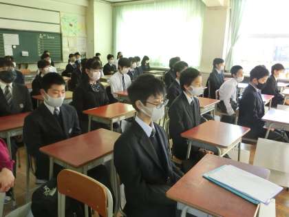 学級委員長の話を聴く1年生です。