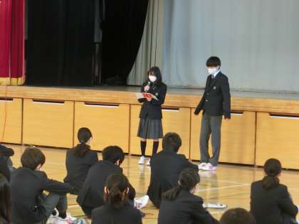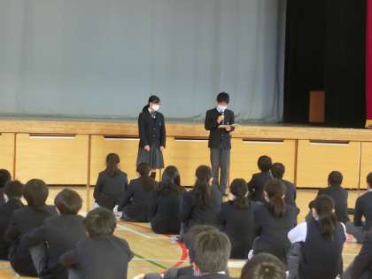 2年学年集会3 12月25日(金) 公開日 2020/12/25 更新日 2020/12/25 できごと 各学級委員の反省をしっかりと心に刻み、3学期自分のクラスをさらに良いクラスにしてください。 いいね(0)