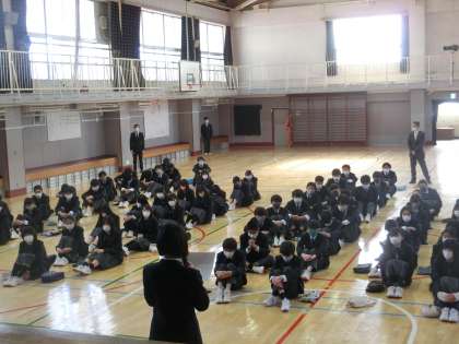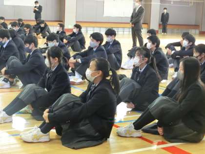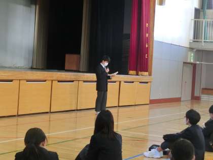 3年学年集会2 12月25日(金) 公開日 2020/12/25 更新日 2020/12/25 できごと 2学期は、クラスで協力できたことやまだまだ課題となることがあったので、3学期は入試、卒業にむけてさらにパワーアップした3年生になってください。 いいね(0)