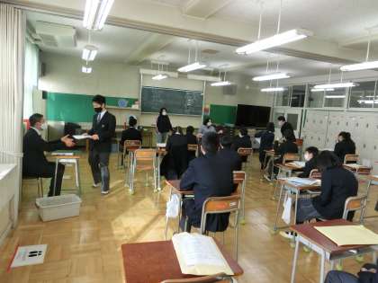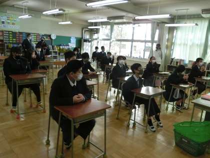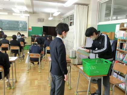 I組では、冬休みの宿題等提出物を一人一人担任の先生が受け取りました。