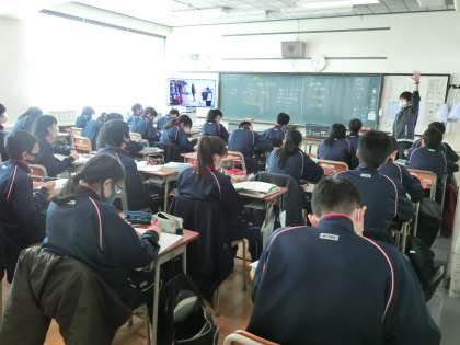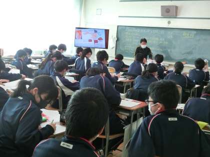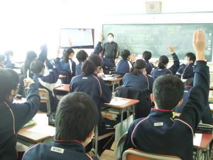 何の授業でしょうか。積極的に手をあげる弦中生。いいですね。社会の時間?!