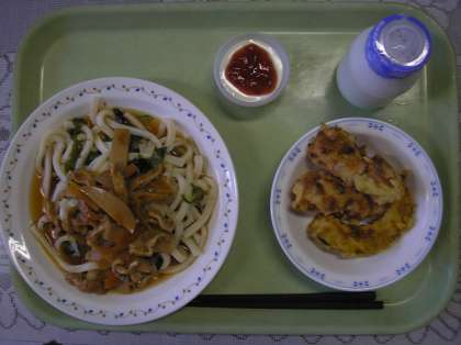 今日の私の好きな給食のメニューは、冷やしきつねうどんです。ちくわとカボチャの天ぷらもとても美味しく頂きました。本日ランチルーム給食がありましたので、ランチルームでは、豆腐と豆乳を使ったアイデアたっぷりのプリンが出ました。イチゴジャムがトッピングされています。とても豆腐を使ったとは思えない逸品でした。(校長)