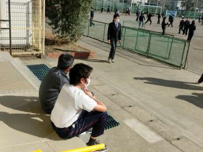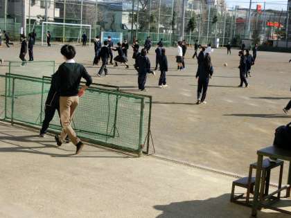 温かい昼下がり。校庭で、子どもたちと遊ぶ一倉先生&丸山先生でした。