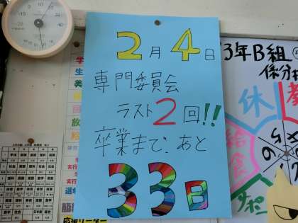 3年生の教室にはカウントダウンカレンダー。あと卒業まで「33日」!!