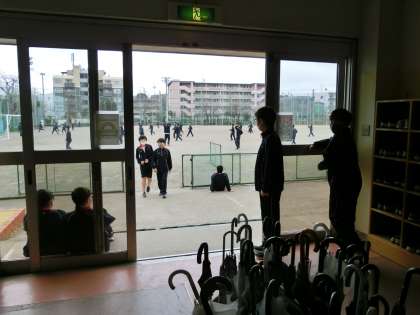 窓から校庭を眺めながら、強風を楽しんでいる生徒たちです。