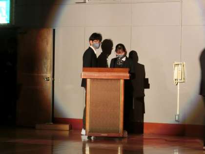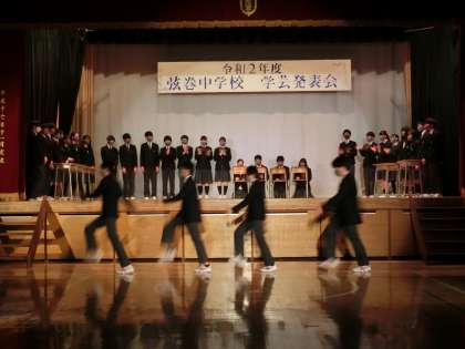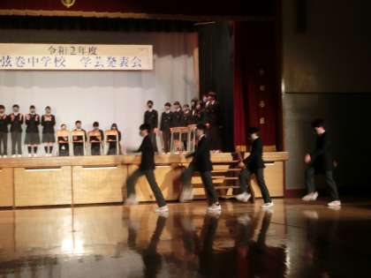 2年D組、四分隊と愉快な仲間たち。見どころは、四分隊の足に合わせてリズムが進んでいきます。四分隊を基準にリズムが進んでいきます。リズムが増えたり減ったりして、机、いす、手、足を使ってリズムを作ります。全員そろって「弦中マスク着用」で頑張ります。