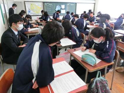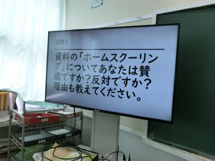 今日の授業4 3月12日(金) 公開日 2021/03/12 更新日 2021/03/12 できごと 3年生の先生が1クラスずつ道徳の特別授業を行っています。仲先生の課題「ホームスクーリングについて」賛成か反対か。みんな考えていました。 いいね(0)