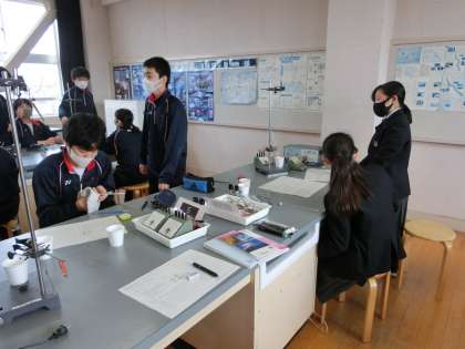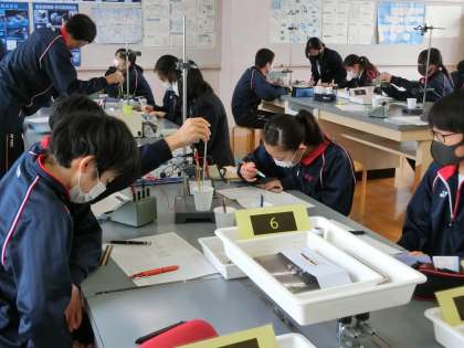 2年生理科の実験の授業。みんな実験に夢中。